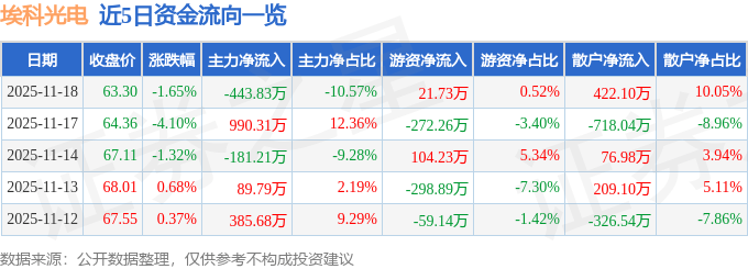 证券之星消息,截至2025年11月18日收盘,埃科光电(688610)报收于63.3元,下跌1.65%,换手率1.61%,成交量6596.0手,成交额4200.35万元。