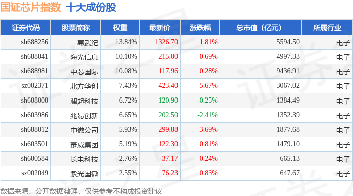 证券之星消息,11月18日,国证芯片(980017)指数报收于12427.75点,涨0.92%,成交583.59亿元,换手率1.54%。当日该指数成份股中,上涨的有19家,北方华创以5.67%的涨幅领涨,下跌的有11家,闻泰科技以4.49%的跌幅领跌。