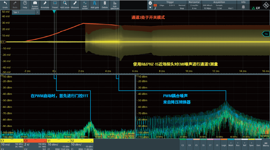 示波器的门控FFT功能允许在采集的时域信号中用户定义的区域进行FFT分析。通过在信号中移动这个时间窗口,可以确定时域信号的哪些部分与频谱中的哪些事件相关。例如,将开关模式电源产生的不希望的发射与开关晶体管的过冲相关联。