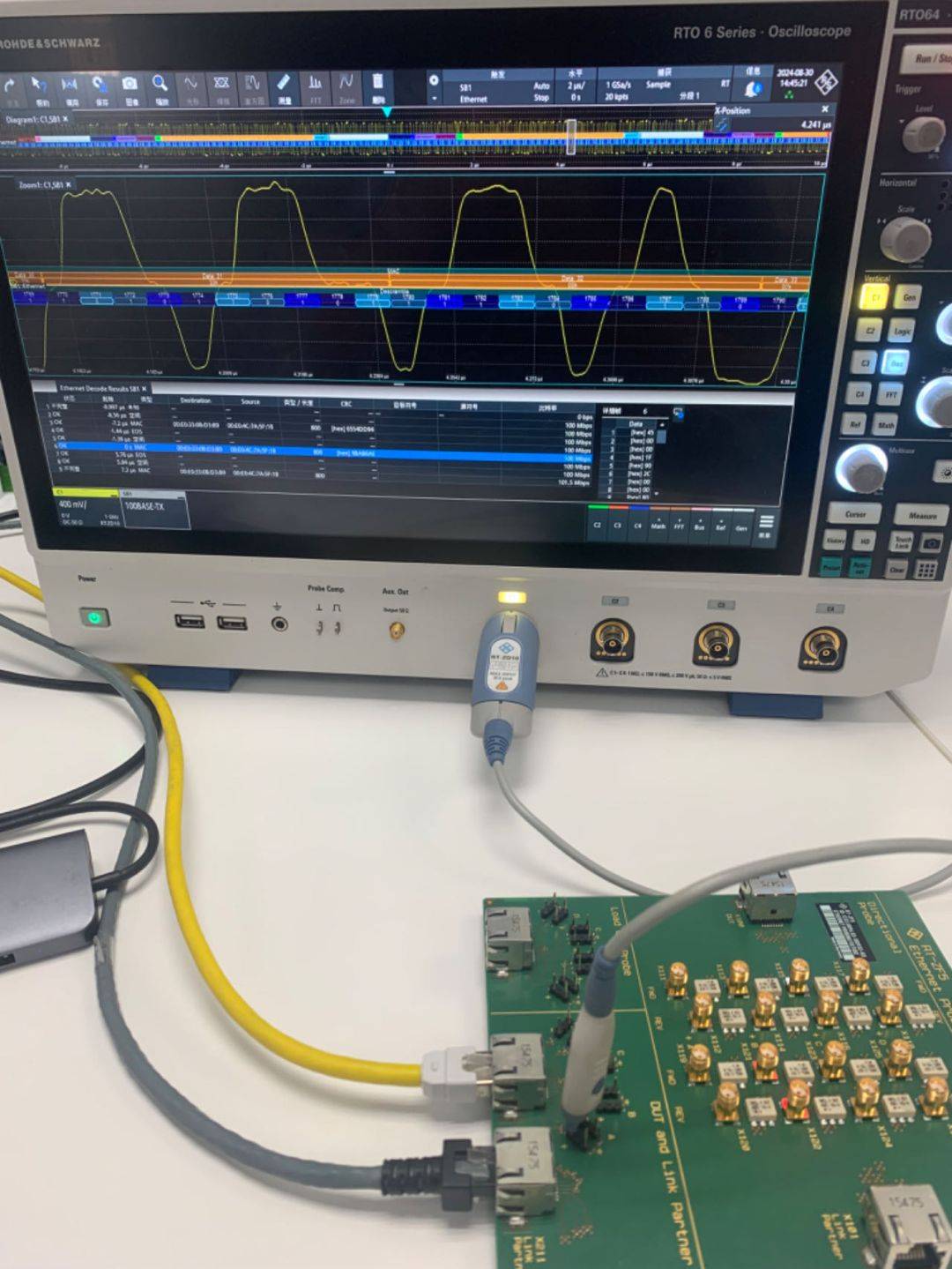 并且将这台电脑通过百兆以太网口接上另一台电脑,同时我们用差分探头和夹具在网线中间探测波形,观察波形是否能与程序中发的数据对应。