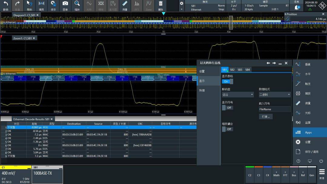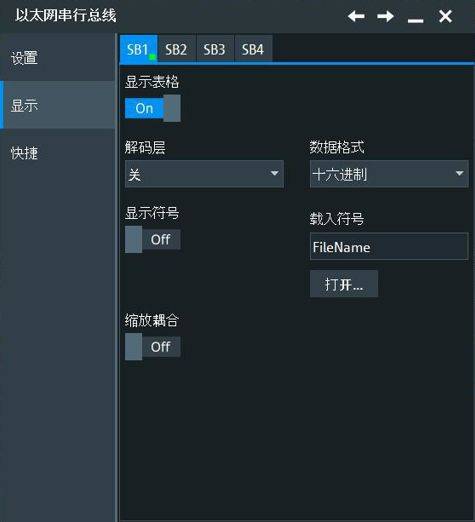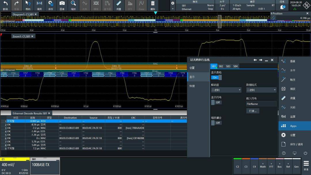 在显示设置中,右侧的数据格式指的是对于解出数据结果如何显示,如果要观察MAC地址建议选十六进制,如果要观察IP地址建议选无正负(整数),最终要对比4B5B结果时建议选二进制。解码层也很重要,尤其是后面对比波形和解码结果时,打开后会在彩色解码结果下出现额外的蓝色结果,我们会在文章的后半部分对其详细讲解。
