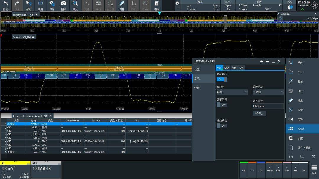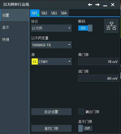 我们可以开启百兆以太网解码,并按上图选择100BASE-TX,还可以点击自动设置。