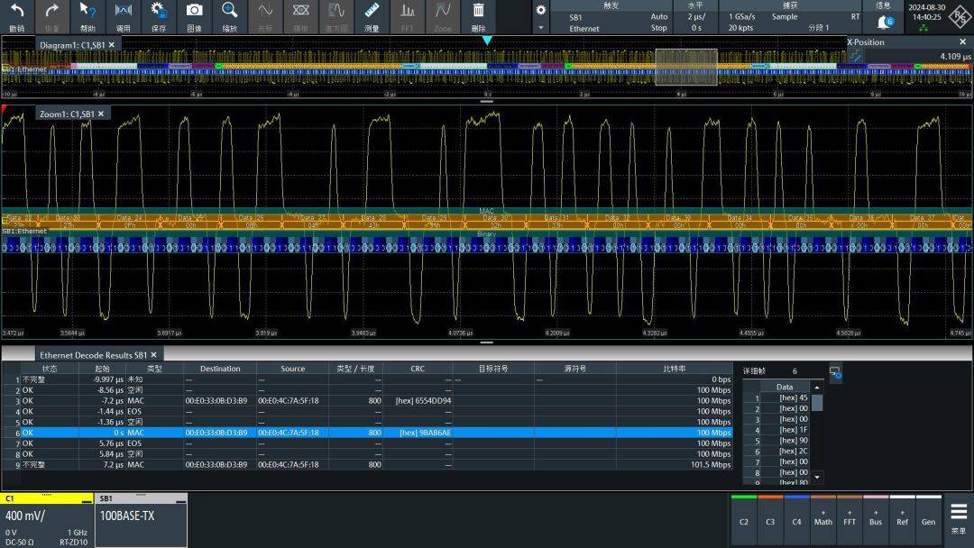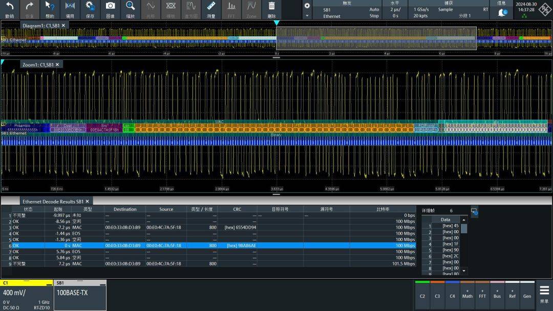 你可以看到缩放窗口中是完整的以太网数据,开头是前导码,后面淡蓝色是SFD,然后是目标MAC和源MAC,绿色是LenType,橙色是数据,数据后面是FCS也就是CRC,再然后深灰色是EOS,浅灰色是IDLE。