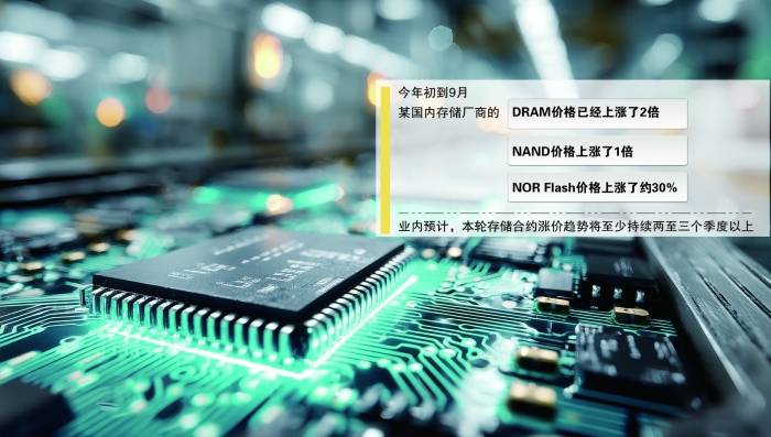 “相较于9月的价格,我们认为至少还有50%的上涨空间。”对此,某国内存储厂商人士表示乐观。据介绍,从今年初到9月,该公司的DRAM价格已经上涨了2倍,NAND价格上涨了1倍,NOR Flash价格上涨了约30%。