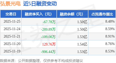 证券之星消息,11月25日,弘景光电(301479)融资买入283.65万元,融资偿还351.43万元,融资净卖出67.78万元,融资余额1.5亿元。
