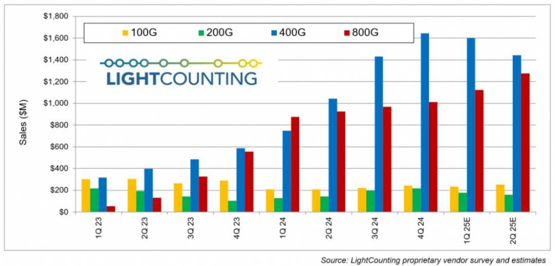 2025年Q2,全球光模块的销售额环比增长10%,主要来自800G以太网光模块的贡献,1.6T产品亦有贡献。随着亚马逊和Meta等云计算巨头向更高速光模块过渡,400G以太网光模块的销售将下降。
