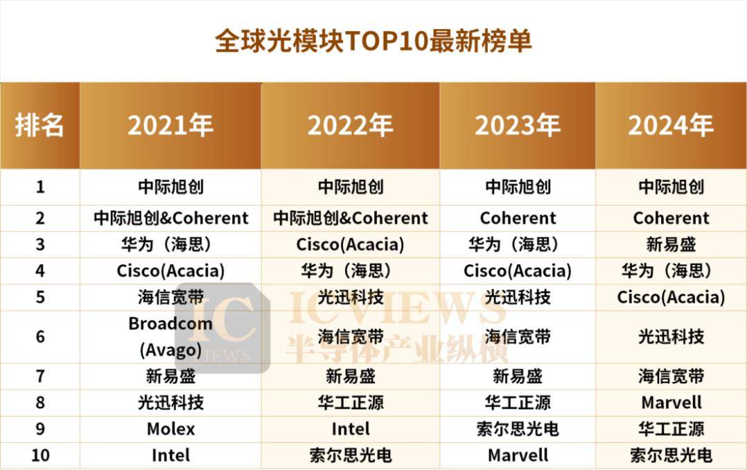 除中际旭创和新易盛外,华为排名第4,光迅科技位列第6,海信宽带、华工正源分列第7与第9位。这一格局充分展现了中国厂商在全球光模块市场的领先地位。