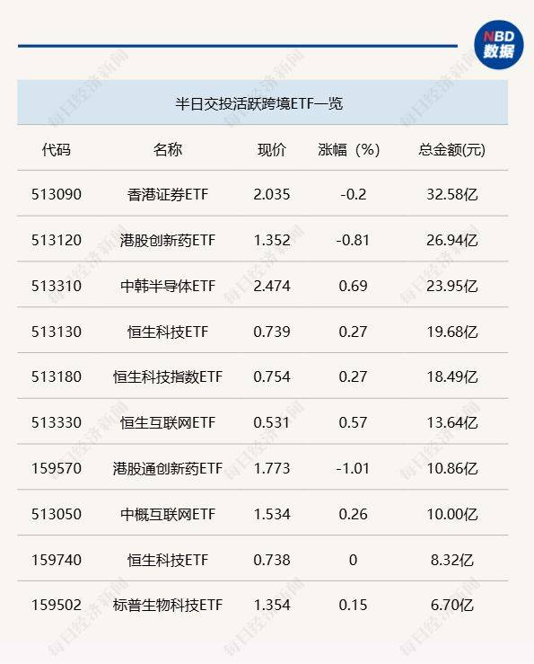 11月28日上午,半导体与证券相关ETF交投相对活跃,其中,科创芯片ETF(588200)半日成交金额为15.65亿元,证券ETF(512880)半日成交金额为11.39亿元。跨境ETF方面,港股市场相关ETF交投缩量显著,无一只ETF半日成交金额达35亿元。