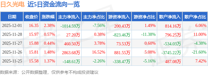 证券之星消息,截至2025年12月1日收盘,日久光电(003015)报收于16.35元,上涨2.38%,换手率3.33%,成交量8.25万手,成交额1.34亿元。