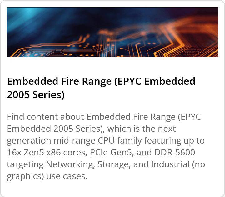 该系列也被称为 EPYC Embedded Fire Range,与采用 FL1 插槽的锐龙 9 9950X3D 等标准 "Fire Range" 系列处理器同源,属于中端级别产品,提供至多 16 个 "Zen 5" 微架构核心、DDR5-5600 内存支持、PCIe Gen5 通道,面向网络、存储、工业用例。