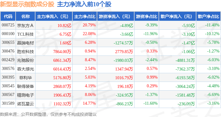 资金流向方面,新型显示(970048)指数成份股当日主力资金净流出合计5.37亿元,游资资金净流出合计7.24亿元,散户资金净流入合计12.6亿元。成份股资金流向详情见下表: