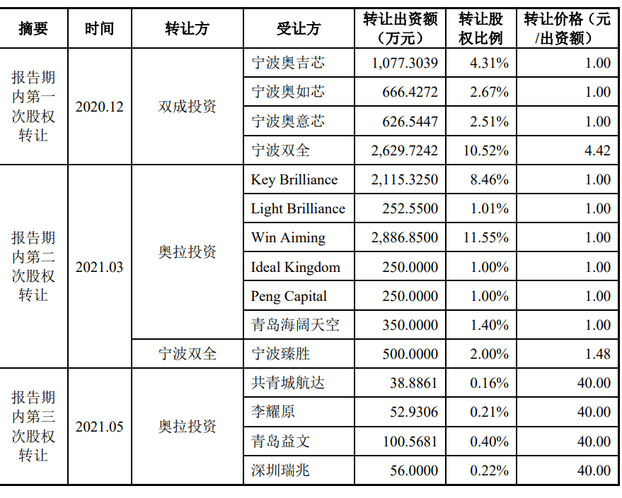 收购来的奥拉半导体,逐渐成为王成栋家族产业的门面。根据奥拉半导体此前的科创板IPO招股书,在其2021年5月和6月的的第三次和第四次股权转让中,外部投资者股权受让价格均为 40 元/出资额,这也意味着投资者是以100亿元的估值,从王成栋等管理层和员工拿到股份。而奥拉半导体的股权价格在此两个月前,仅为转让价的三十分之一,甚至四十分之一。