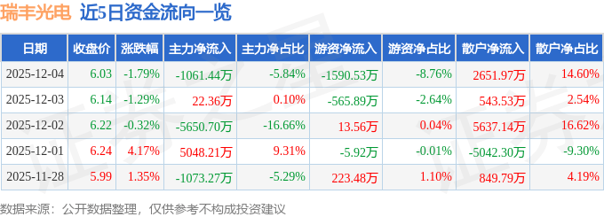 证券之星消息,截至2025年12月4日收盘,瑞丰光电(300241)报收于6.03元,下跌1.79%,换手率5.13%,成交量30.09万手,成交额1.82亿元。
