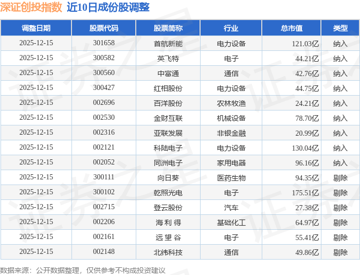 近10日内深证创投(399696)指数成份股做了调整,新纳入了9只股票,剔除了6只股票。