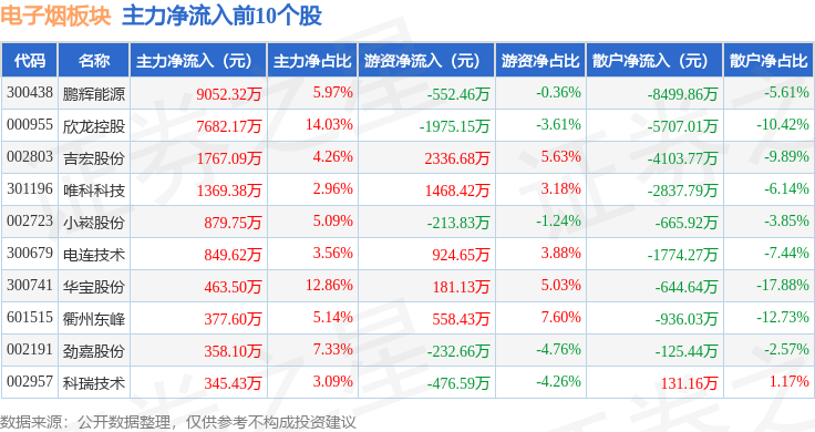 从资金流向上来看,当日电子烟板块主力资金净流出26.06亿元,游资资金净流入5.45亿元,散户资金净流入20.6亿元。电子烟板块个股资金流向见下表: