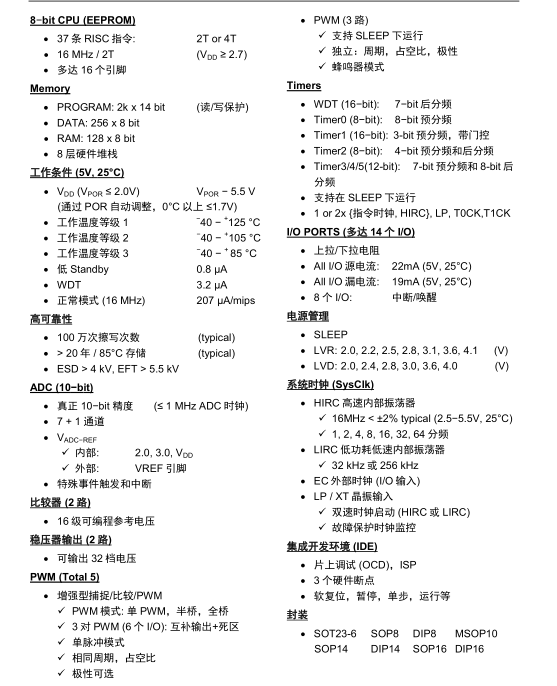 FT61FC2X是辉芒微电子A/D型8位系列单片机,指令周期2T/4T可选。专门为需要A/D转换的产品而设计,例如传感器信号输入。此款单片机特点为宽电压工作范围2.0V至5.5V、多通道A/D转换、高耐用EEPROM、内置16MHz高速RC振荡器、内置32KHz低速RC振荡器、欠压检测、支持在系统编程ISP和在线调试,提供SOP8、SOP14和SOP18三种封装选择。