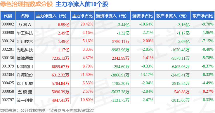资金流向方面,绿色治理(980058)指数成份股当日主力资金净流出合计43.19亿元,游资资金净流入合计7.13亿元,散户资金净流入合计36.06亿元。成份股资金流向详情见下表: