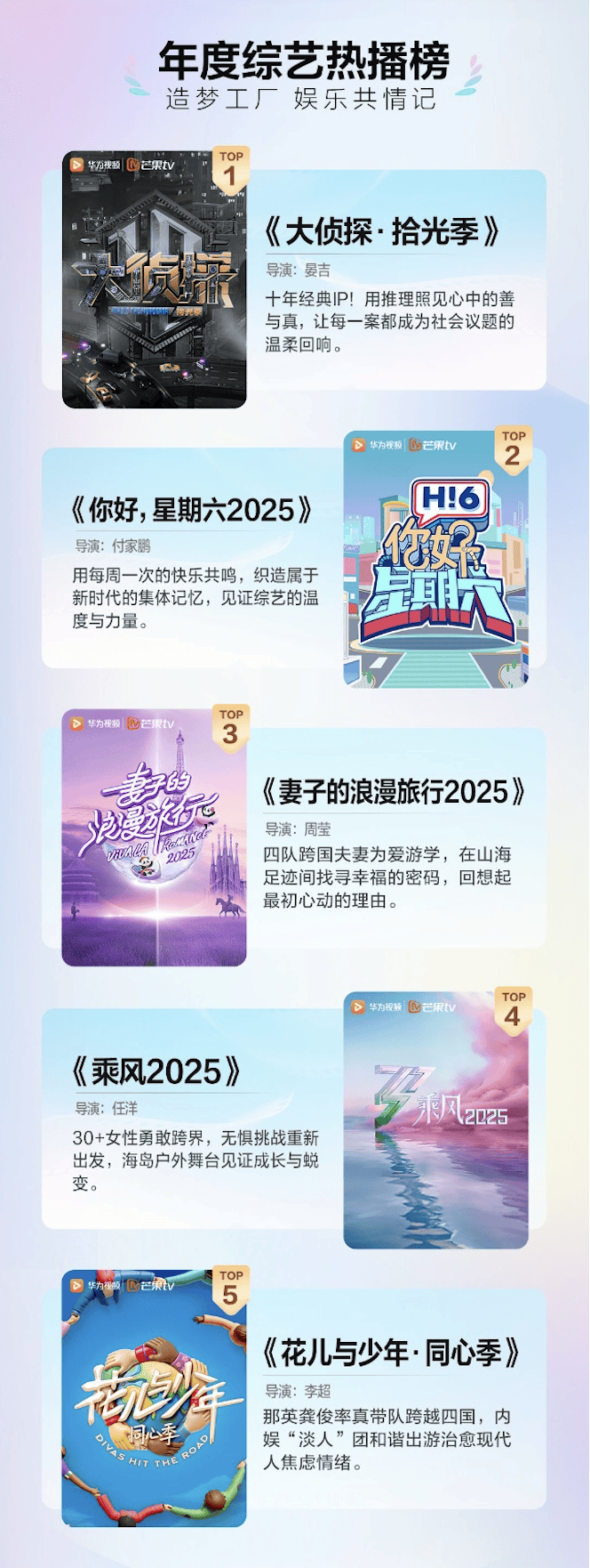 综艺热播榜这边更是我的快乐老家!《大侦探·拾光季》登顶我是毫不意外,我家电视都快能自动循环播放了。死忠粉们表示:上榜?基操而已啦。每周六雷打不动的快乐,当然是《你好,星期六2025》给的!《乘风2025》更不用说,姐姐们这么有魅力谁能不爱?这榜单可是把咱们平时常追的热门综艺一网打尽了,排得相当合理。
