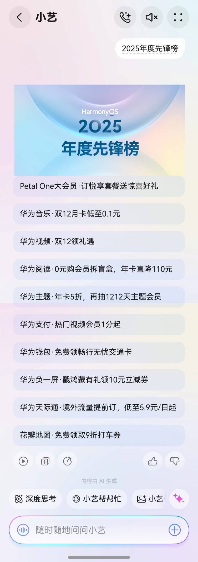 如果你也好奇今年大家都爱看什么,或者想解锁“一站式”刷遍热门内容的体验,不妨打开华为视频试试看。现在长按手机电源键唤醒小艺,对它说“2025年度先锋榜”,说不定就有小惊喜随机掉落哦。