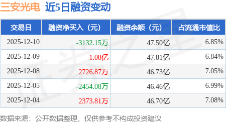 证券之星消息,12月10日,三安光电(600703)融资买入1.28亿元,融资偿还1.59亿元,融资净卖出3132.15万元,融资余额47.5亿元。