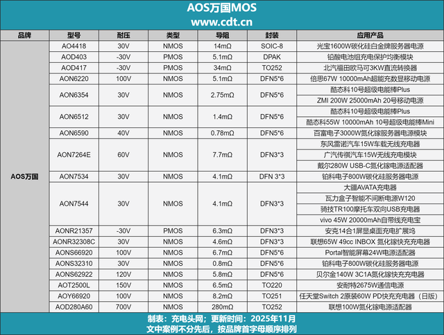 最近,充电头网在整理近期拆解案例时,发现有多款知名品牌充电设备内置AOS万国半导体MOS管,下文小编将为您详细介绍。