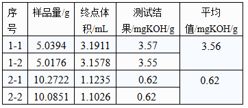 测试结果:经测试,两款烟用香精酸值分别为3.56mgKOH/g以及0.62mgKOH/g。