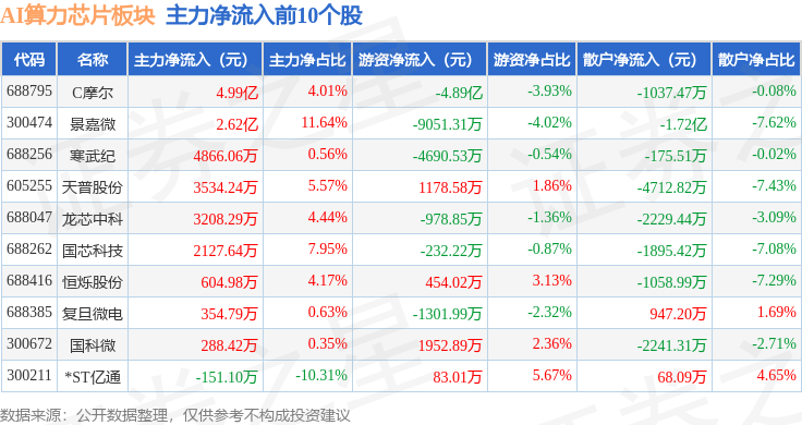 从资金流向上来看,当日AI算力芯片板块主力资金净流出4.12亿元,游资资金净流入3668.29万元,散户资金净流入3.75亿元。AI算力芯片板块个股资金流向见下表: