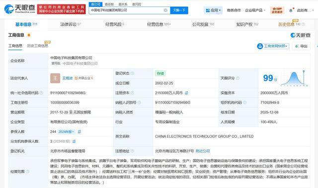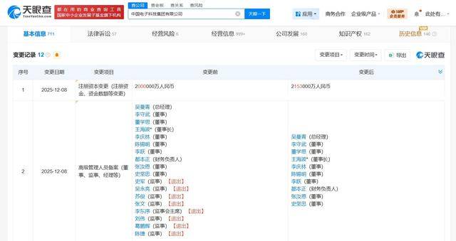 天眼查App显示,近日,中国电子科技集团有限公司发生工商变更,注册资本由200亿人民币增至215.3亿,增幅约7.7%,同时,多位主要人员发生变更。