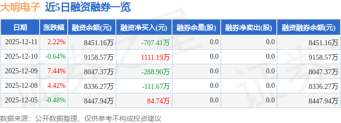 大明电子融资融券信息显示,融资方面,当日融资买入2713.43万元,融资偿还3420.84万元,融资净偿还707.41万元。融券方面,融券卖出0.0股,融券偿还0.0股,融券余量0.0股,融券余额0.0万元。融资融券余额8451.16万元。
