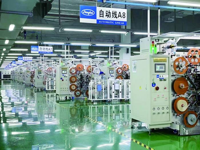 在江海股份电容生产智能车间里,自动化设备正以恒定的节奏,将电解纸和电极箔卷绕成一个个规整的圆柱体,随后这些圆柱体被送入电解液含浸装置,几个小时后再经过密封、老化、测试、包装等工序,即可出厂开启它们的使命。
