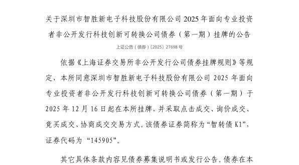 12月15日,上交所发布关于深圳市智胜新电子科技股份有限公司2025年面向专业投资者非公开发行科技创新可转换公司债券(第一期)挂牌的公告。