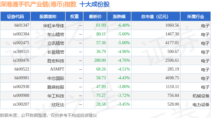 深港通手机产业链(港币)(983010)指数十大成份股详情如下: