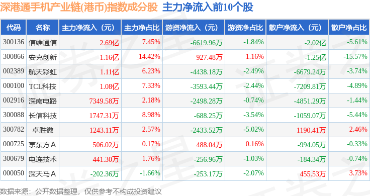 资金流向方面,深港通手机产业链(港币)(983010)指数成份股当日主力资金净流出合计64.69亿元,游资资金净流入合计17.88亿元,散户资金净流入合计46.81亿元。成份股资金流向详情见下表: