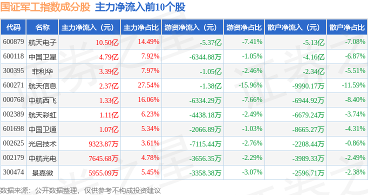 资金流向方面,国证军工(399368)指数成份股当日主力资金净流入合计15.33亿元,游资资金净流出合计12.06亿元,散户资金净流出合计3.27亿元。成份股资金流向详情见下表: