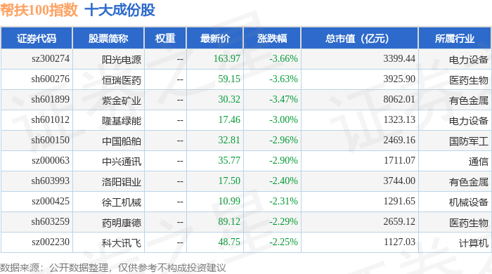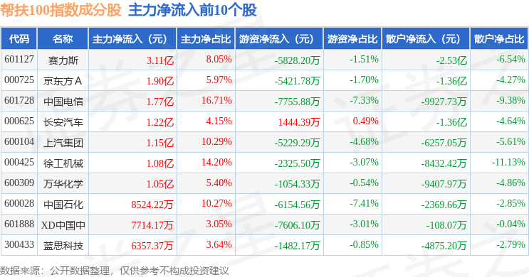 资金流向方面,帮扶100(980065)指数成份股当日主力资金净流出合计79.98亿元,游资资金净流入合计5.53亿元,散户资金净流入合计74.45亿元。成份股资金流向详情见下表: