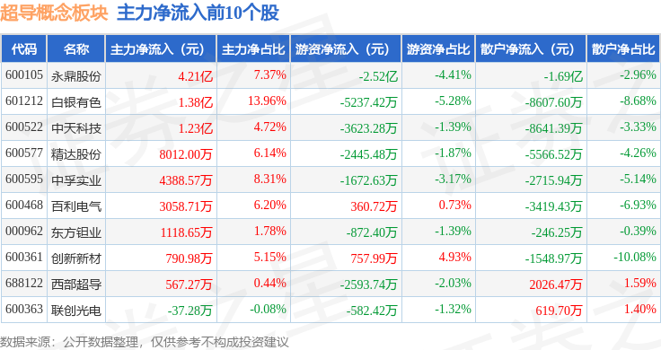 从资金流向上来看,当日超导概念板块主力资金净流入4.34亿元,游资资金净流出3.88亿元,散户资金净流出4642.23万元。超导概念板块个股资金流向见下表: