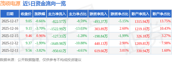 证券之星消息,截至2025年12月17日收盘,茂硕电源(002660)报收于9.05元,下跌0.66%,换手率3.11%,成交量10.67万手,成交额9573.6万元。