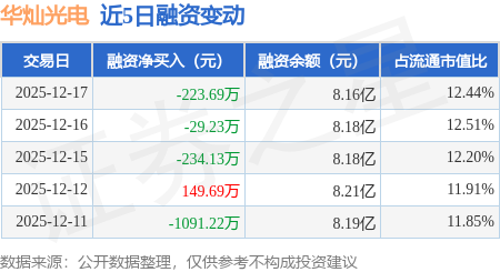 证券之星消息,12月17日,华灿光电(300323)融资买入850.62万元,融资偿还1074.31万元,融资净卖出223.69万元,融资余额8.16亿元。