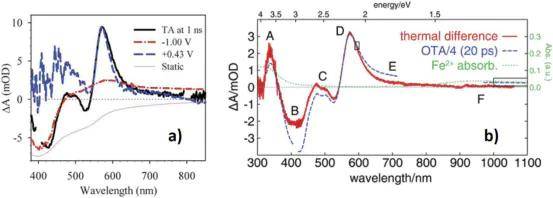 核心原理:瞬态吸收光谱(TA)凭借飞秒至毫秒级的超高时间分辨率,瞬态吸收光谱能完整覆盖电荷转移从激发态生成、跨界面传递到复合湮灭的全动态过程。吸收信号的变化源于不同电荷物种的特征吸收差异,信号的出现对应电荷生成,峰形偏移反映电荷转移,强度衰减则关联电荷复合。