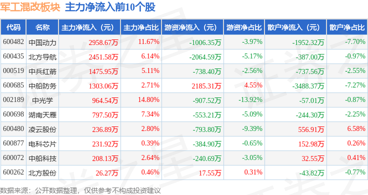 从资金流向上来看,当日军工混改板块主力资金净流出3.2亿元,游资资金净流出3686.41万元,散户资金净流入3.57亿元。军工混改板块个股资金流向见下表: