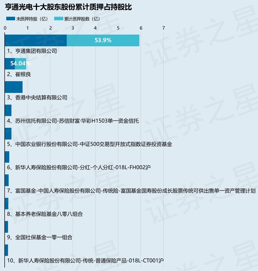 截止本公告日,股东亨通集团有限公司已累计质押股份3.2亿股,占其持股总数的53.9%,股东崔根良已累计质押股份5150.0万股,占其持股总数的54.04%。本次质押后亨通光电十大股东的累计质押股份占持股比例(占持股比例的计算以公司最新一期财务报表公布的十大股东的持股总数为基准)见下图: