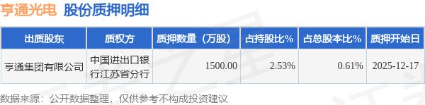 证券之星消息,亨通光电(600487)12月18日公开信息显示,股东亨通集团有限公司向中国进出口银行江苏省分行合计质押1500.0万股,占总股本0.61%。质押详情见下表: