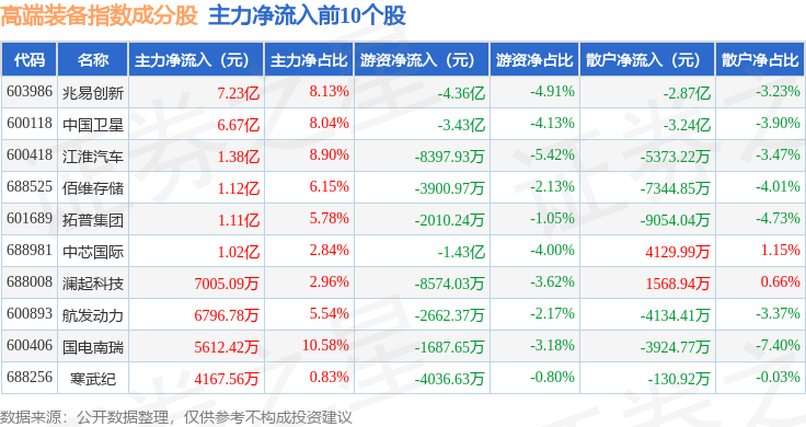 资金流向方面,高端装备(000097)指数成份股当日主力资金净流出合计47.79亿元,游资资金净流入合计4.87亿元,散户资金净流入合计42.91亿元。成份股资金流向详情见下表: