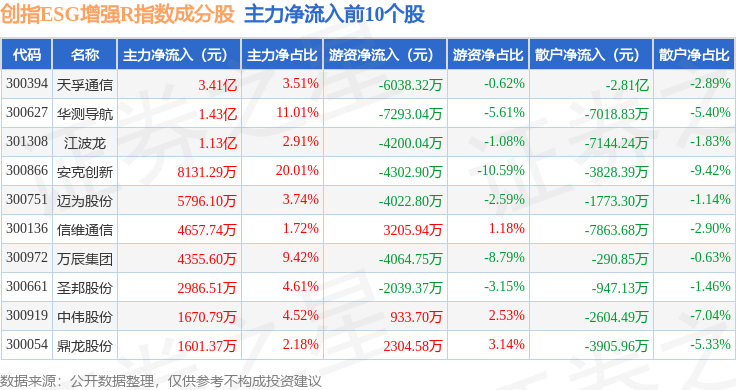 资金流向方面,创指ESG增强R(470034)指数成份股当日主力资金净流出合计48.78亿元,游资资金净流入合计20.38亿元,散户资金净流入合计28.4亿元。成份股资金流向详情见下表: