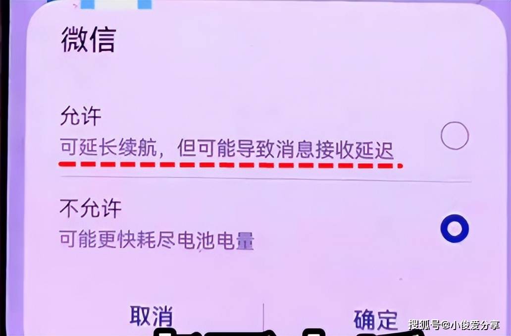 咱比如说像这个微信,点开之后,它会显示一个允许一个不允许。看一下允许的话,这里是写可延长续航时间,所以我们要把这些软件,全部改为允许,改完之后,你会发现电量非常省。