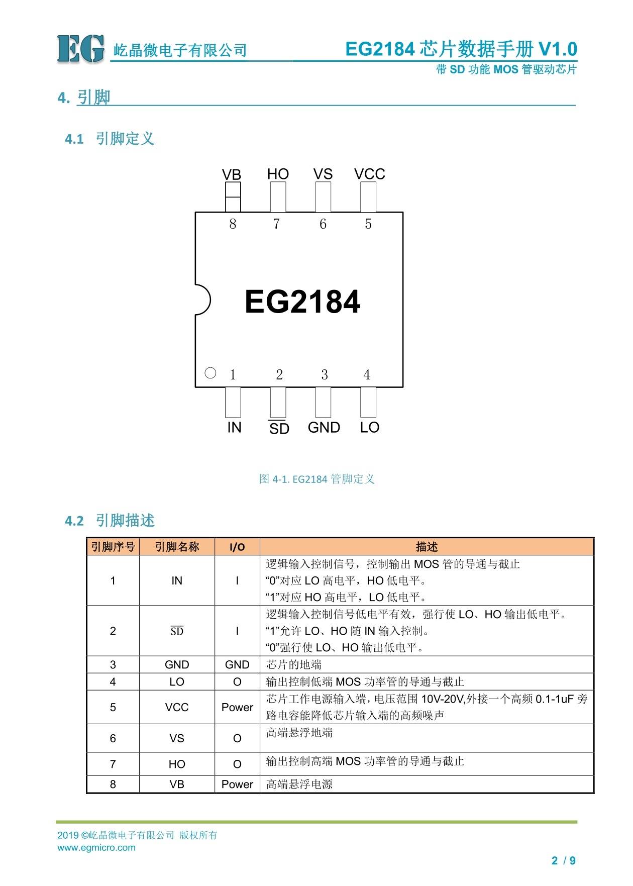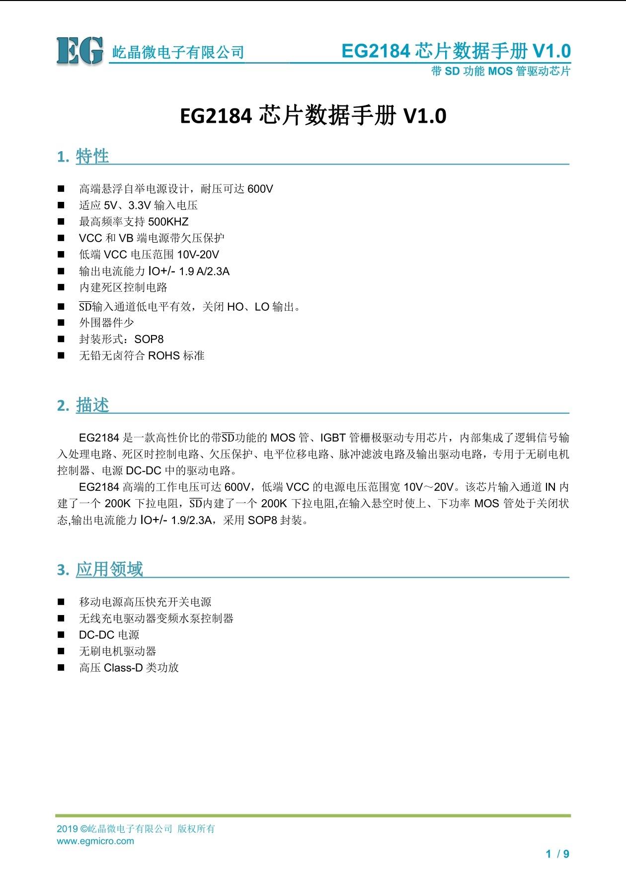 EG2184高端的工作电压可达600V,低端VCC的电源电压范围宽10V~20V。该芯片输入通道IN内建了一个200K下拉电阻,SD内建了一个200K下拉电阻,在输入悬空时使上、下功率MOS管处于关闭状态,输出电流能力IO+/-1.9/2.3A,采用SOP8封装。