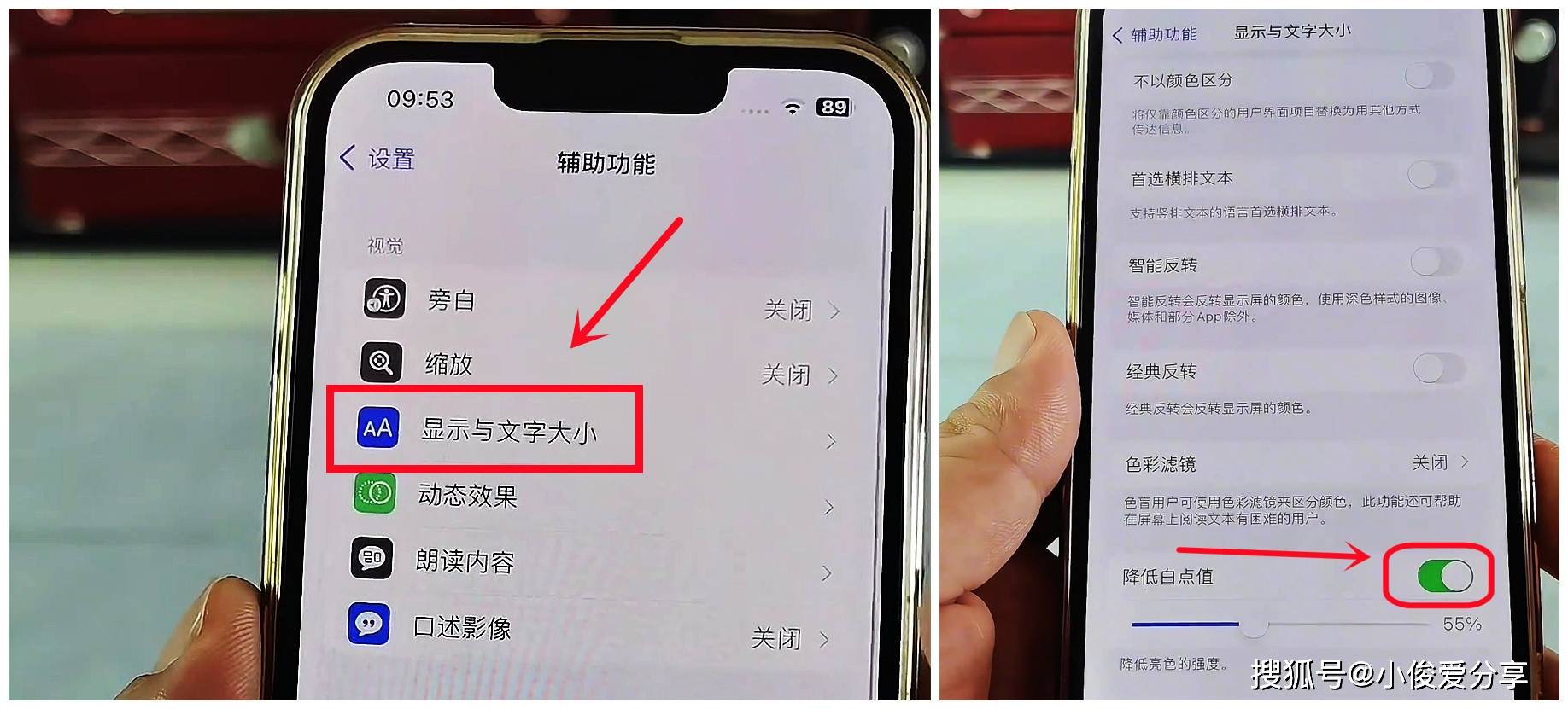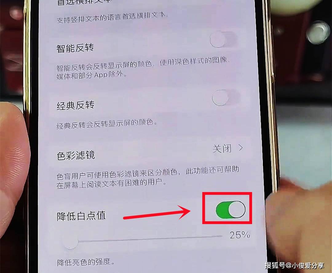 点进去之后,我们往下数第三个,看到没有选择 「显示与文字大小」,点进来之后,一直往下拉,找到 「降低白点值」 这个选项。