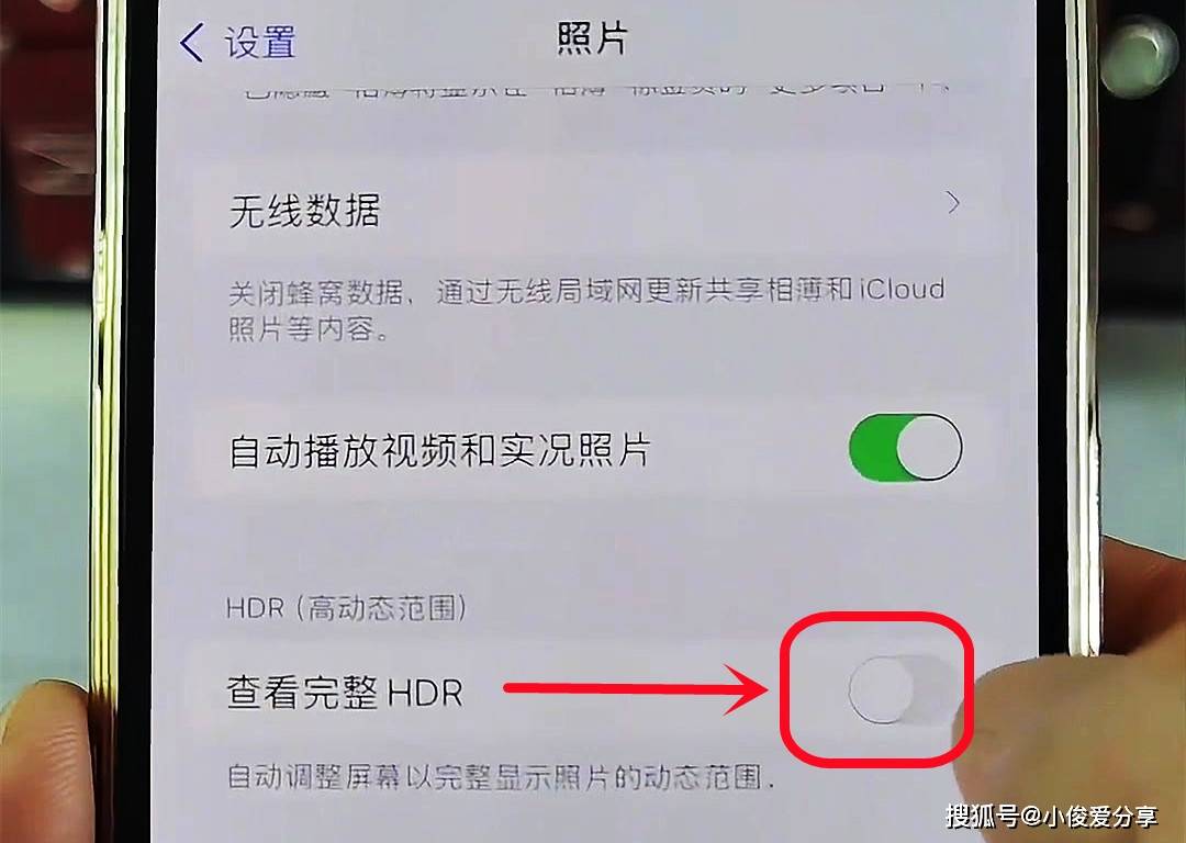 接着我们返回到设置页面看第三个,打开你的照片,相机和照片是靠着的哈,你直接找到照片就行。好,往下看,这里有个叫做查看完整HDR这个开关,一定要给它关掉。