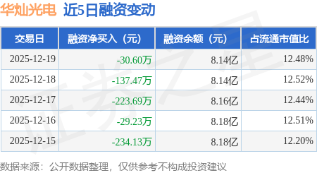 证券之星消息,12月19日,华灿光电(300323)融资买入656.34万元,融资偿还686.95万元,融资净卖出30.6万元,融资余额8.14亿元。