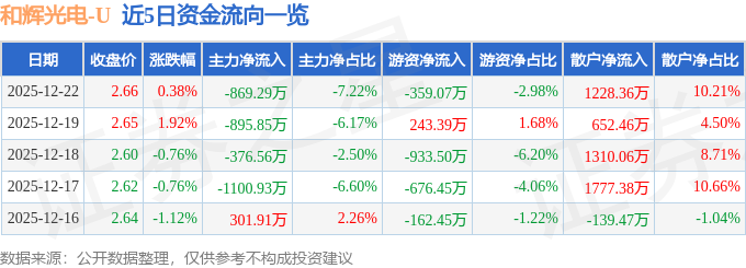 证券之星消息,截至2025年12月22日收盘,和辉光电(688538)报收于2.66元,上涨0.38%,换手率0.78%,成交量45.1万手,成交额1.2亿元。